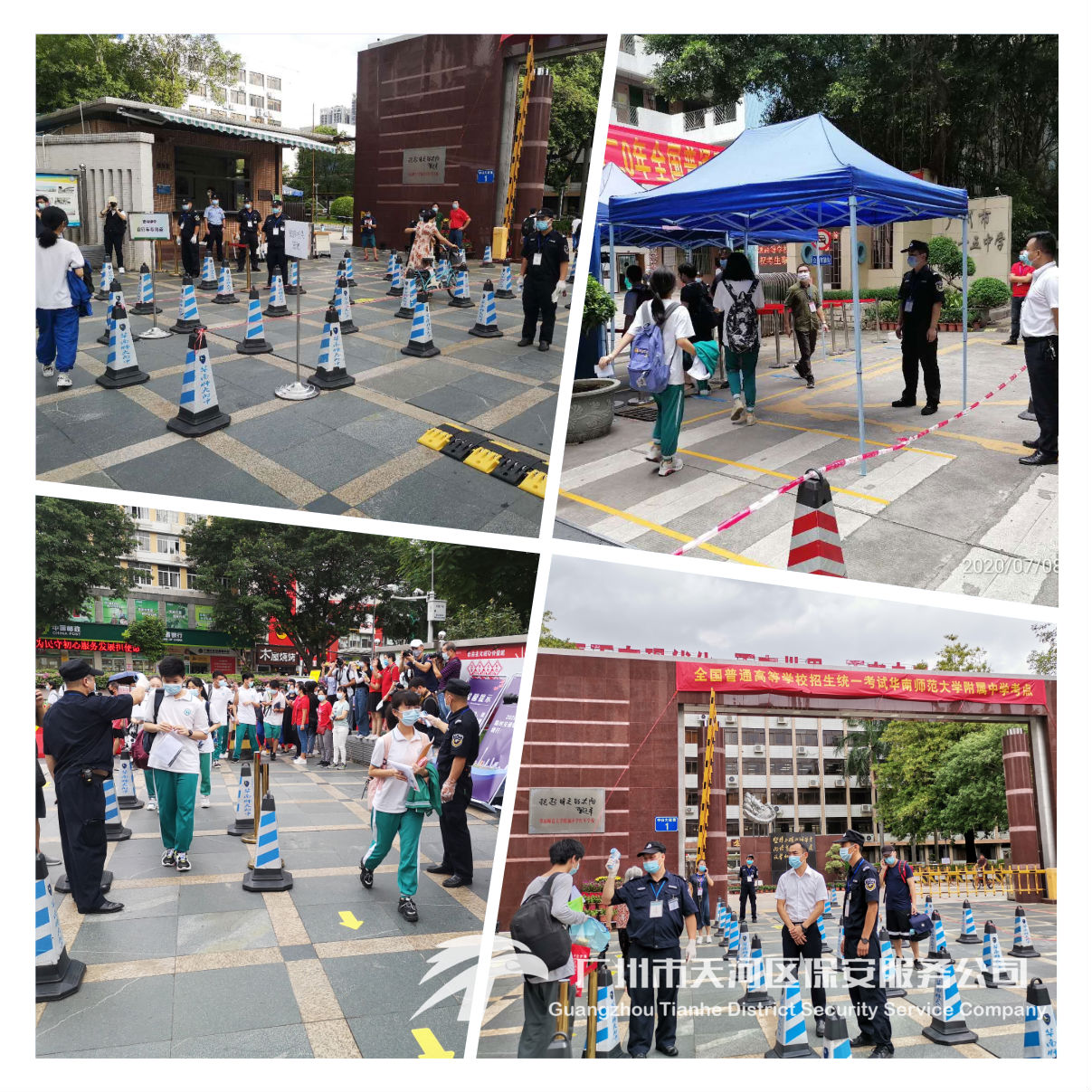 我司驻校安保队伍结合往年安保工作经验和疫情防控知识,针对各个考试学校进行精心部署、周密安排,认真落实各项安保防疫措施,为这次疫情中的高考营造安全可靠的考试环境,确保考生不受外界影响,安心考试。