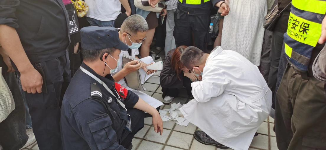 队长刘学海协助医护人员紧急救助中暑观众