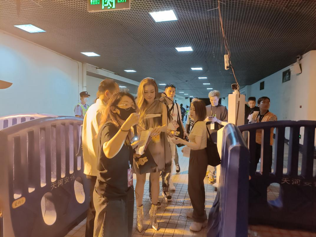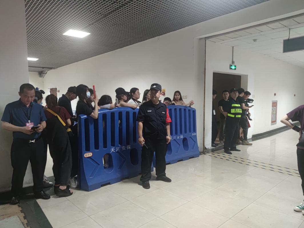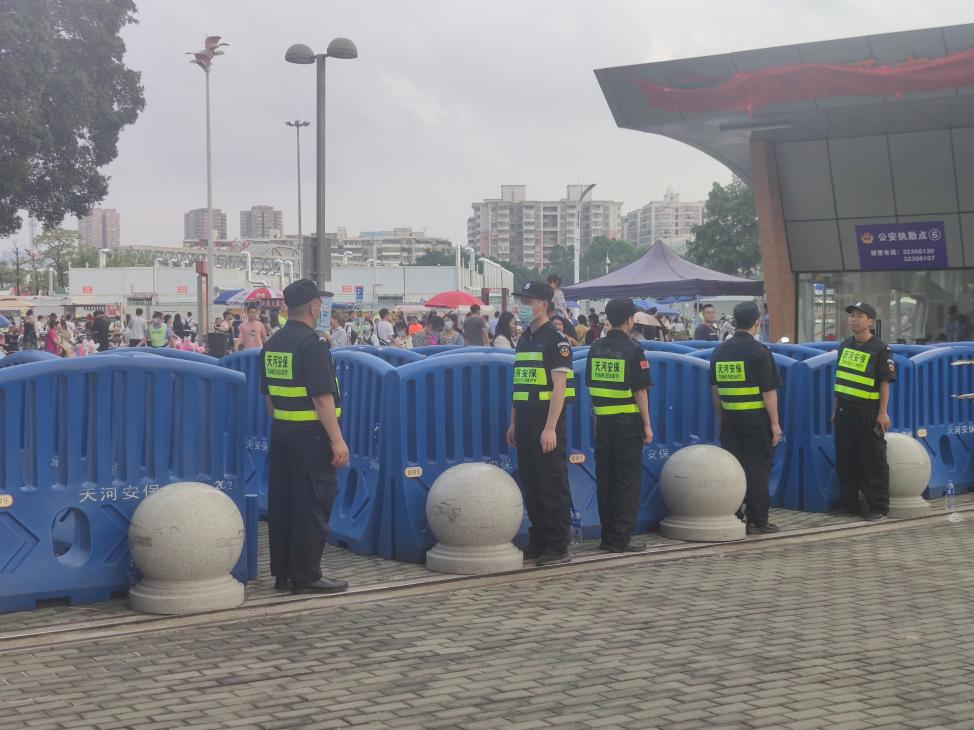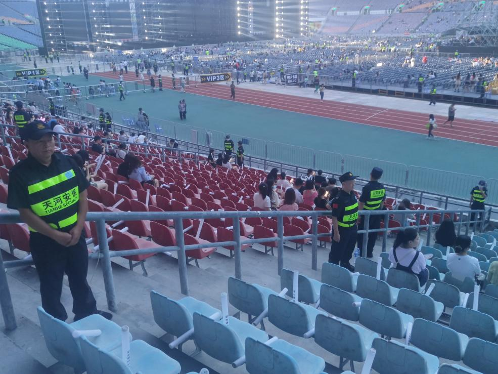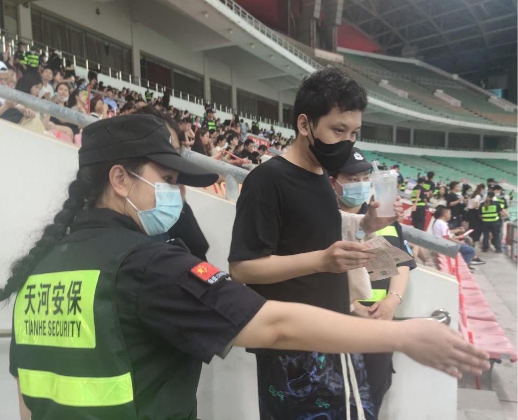 演出现场天河保安执勤队伍,始终保持高度警惕,认真落实各项安检安保措施,严禁一切违禁品带入场地,全力保障现场观众安全,加强场内外巡逻检查和引导疏散,确保通道畅通,对到处跑动,靠近安全护栏等不良现象,及时发现及时制止,维护好现场秩序。